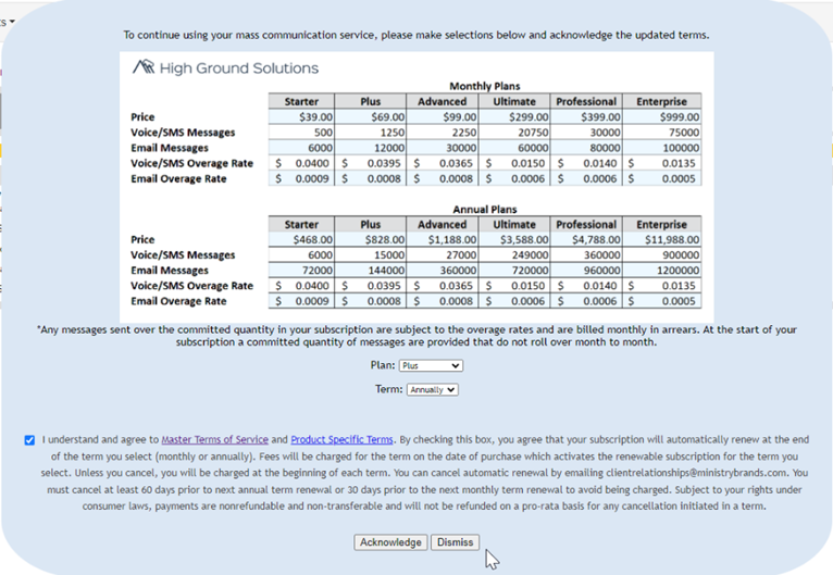 After acknowledgment, our team will implement the new pricing model. HGS users can view their message usage availability, as well as two additional options within their account (2-way SMS and the ability to import their own users).