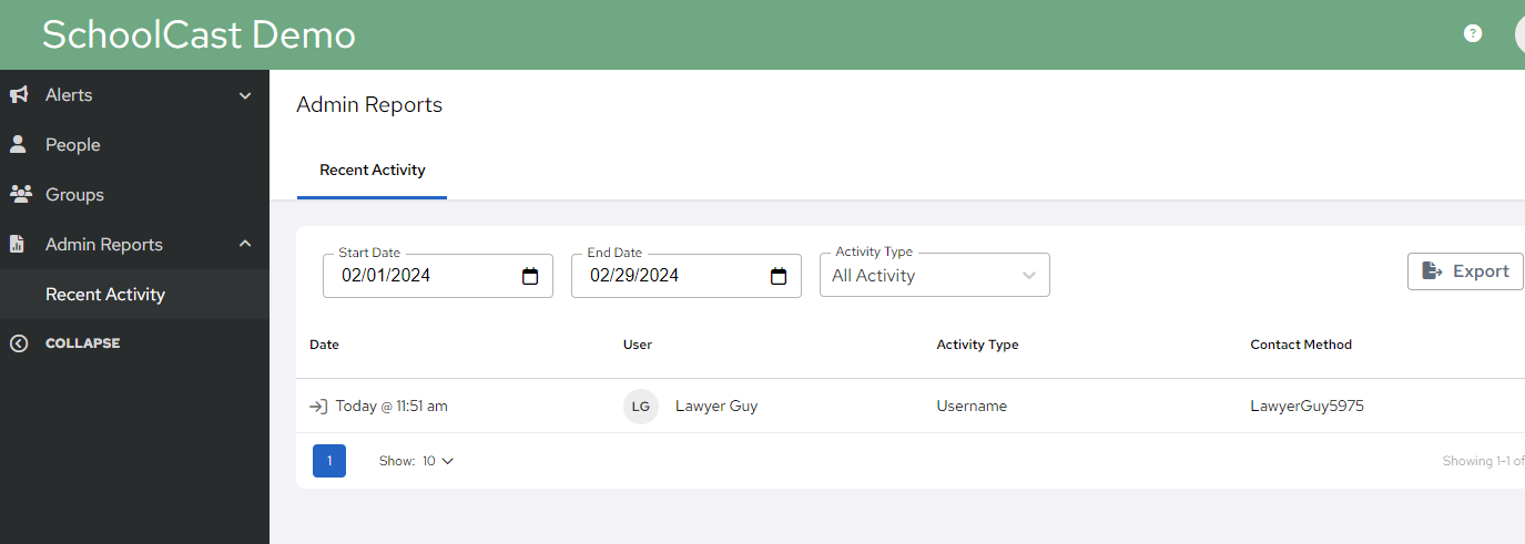 This allows users to see the recent activity completed within the application. Admins can export the report in excel.