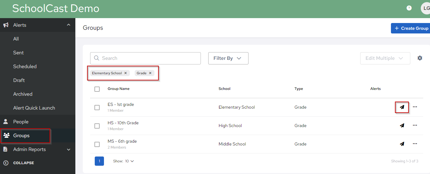 HGS>Send Message> Choose (Group, Type, etc.)>Bar appears under the choices