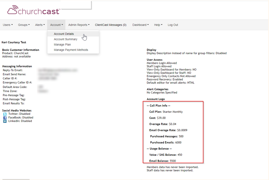 For clients on new SaaS+ Plans, their subscription plan - including price, allotment of messages, and overage rate is listed within their MyCast portal under Account Details. Additionally, their available messages (Usage Balance) are also listed and update automatically as they use the system.